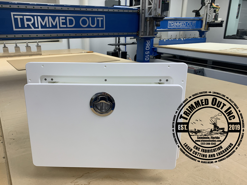 Perfect pull out drawer boat storage box to mount straight into you dash or even on the side of your center console. Made from king starboard with stainless steel latch hardware. Frame measurements are 18 inches wide by 12 inches tall. Cutout dimensions are 16.5 inches wide by 10.5 inches tall The box itself is 9.5 inches deep.