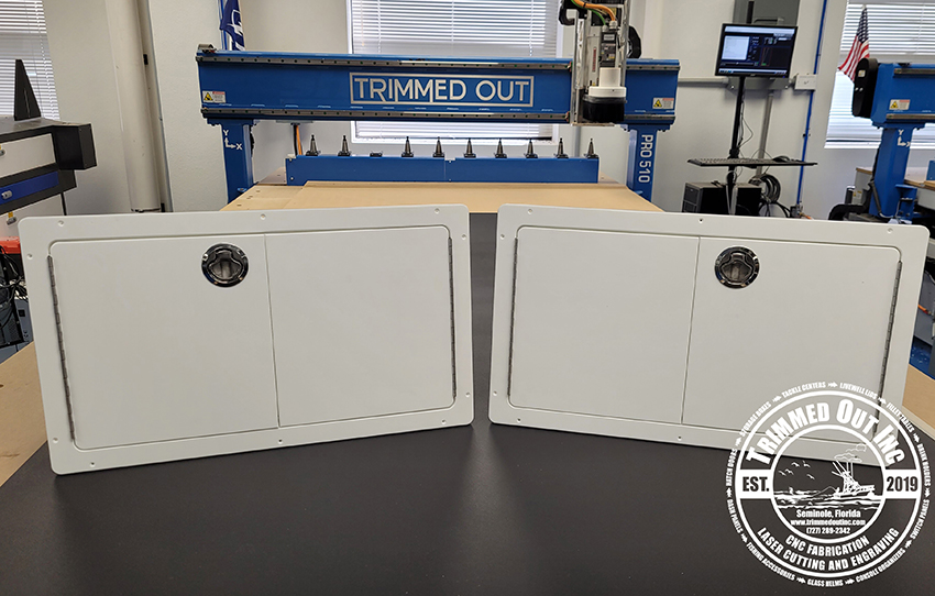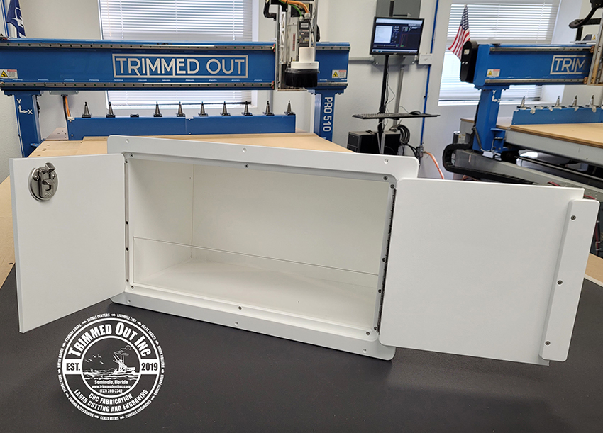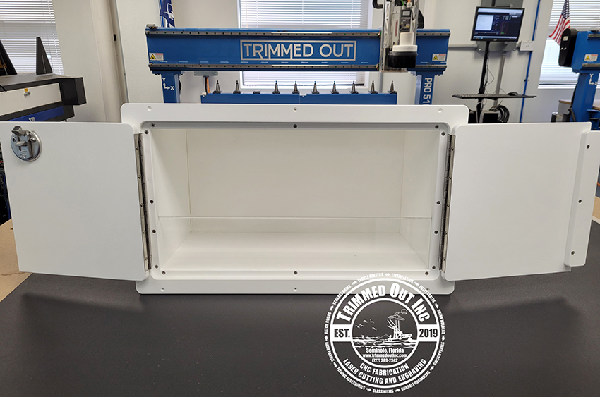 Perfect French-Open door boat storage box to mount straight into you dash or even on the side of your center console. Made from king starboard with stainless steel latch hardware.