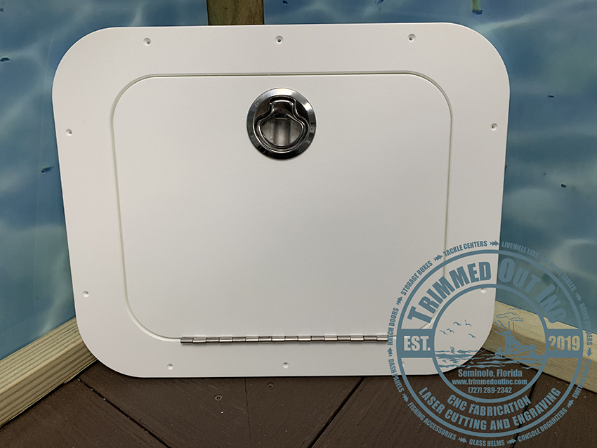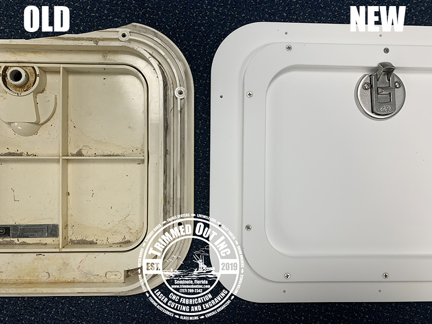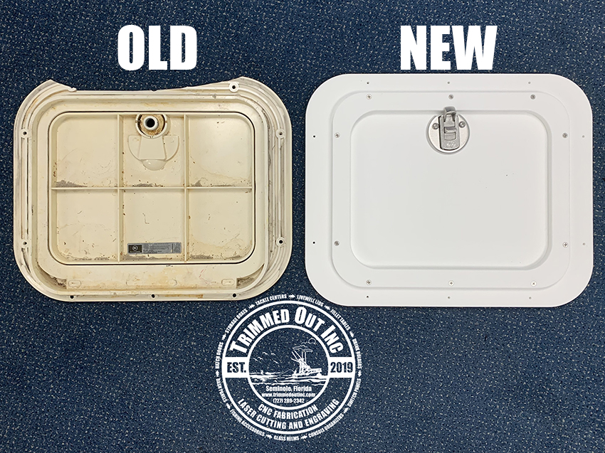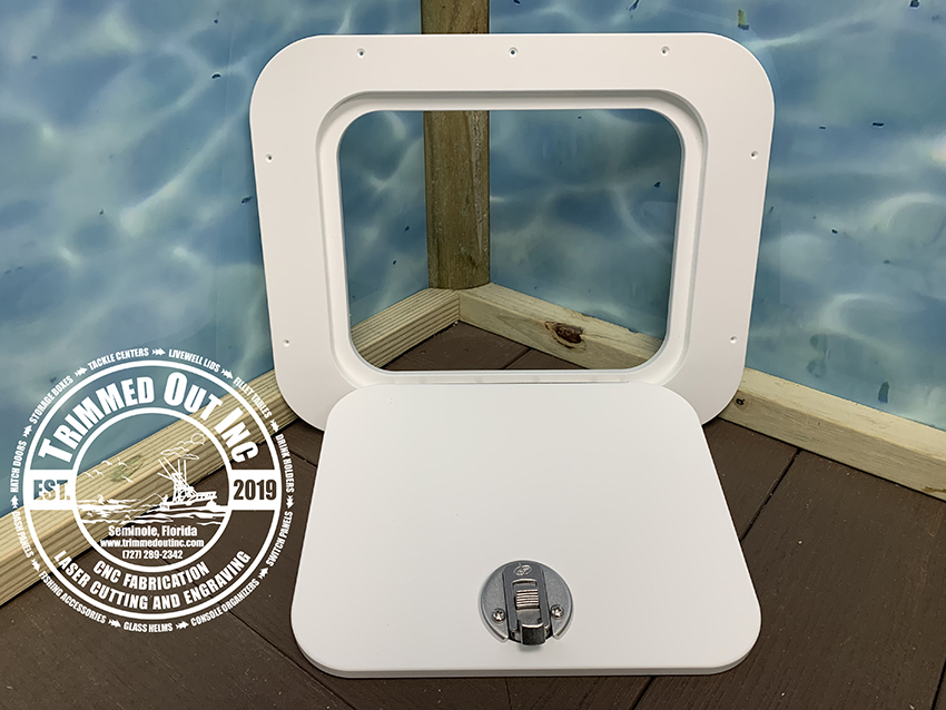This replacement hatch door is built with King Starboard precision cut on our CNC machine. Our competitors may use a FRP Hatch (Fiberglass Reinforced Plastic), which fades, becomes chalky and gives off the fiberglass powder which makes you itchy. This is why we only make hatch doors with King Starboard.