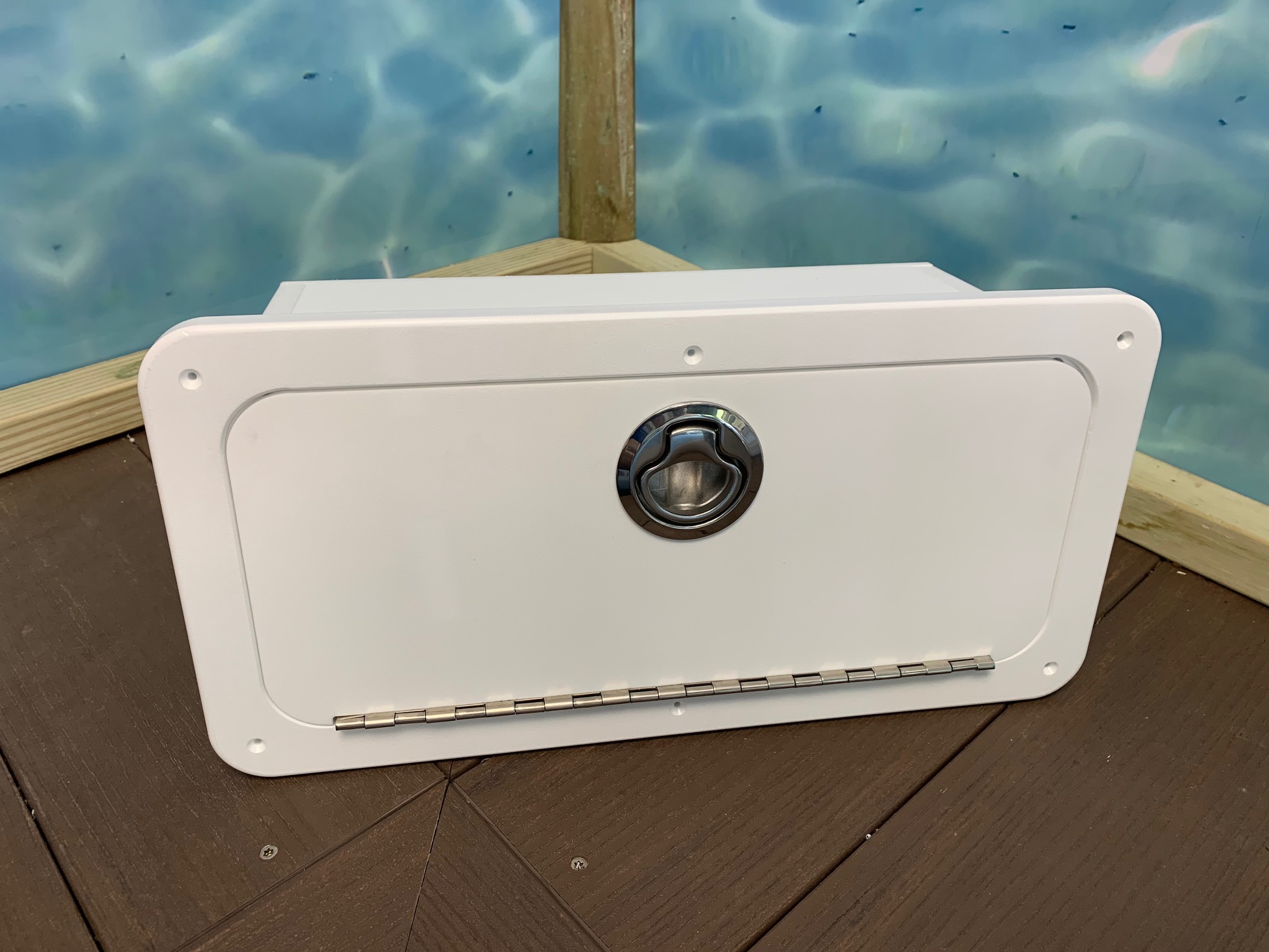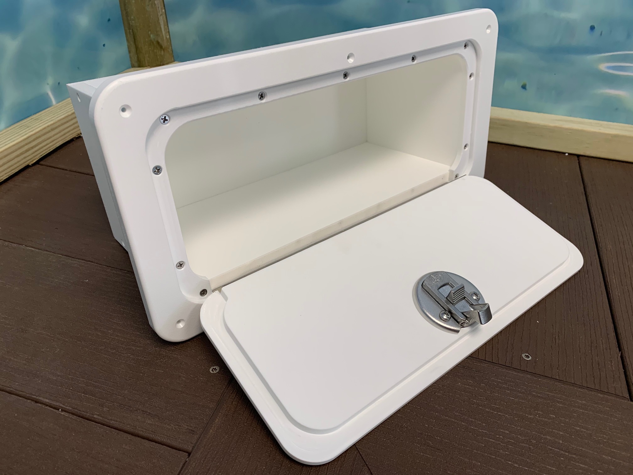 Perfect glove box to mount straight into your dash or even on the side of your center console. Frame measures 8 inches tall by 16 inches wide. The box itself is 6 1/2 inches deep. Great for keeping your personal belongs safe and dry. This Marine Glove Box is made from King Starboard. Choose your preferred latch, options include Gemlux Stainless Steel or black or white plastic.