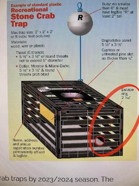 - For the 2024-25 stone crab season and beyond, an unobstructed escape ring 2 3/16 inches in diameter to be located within a vertical exterior trap wall for all recreational and commercial plastic or wood stone crab traps is required.