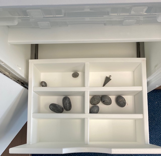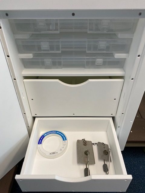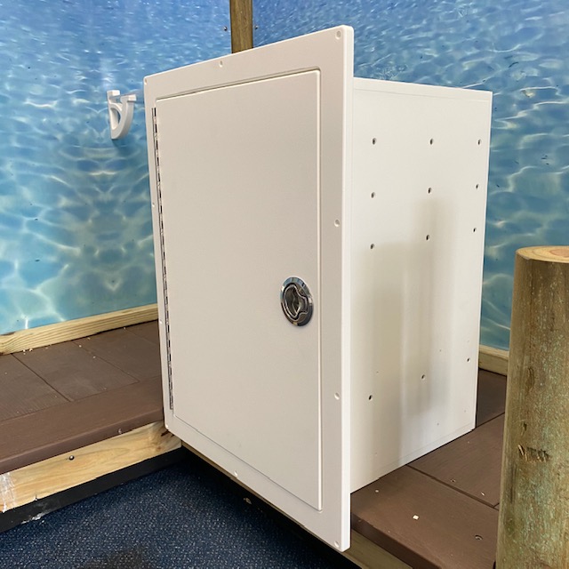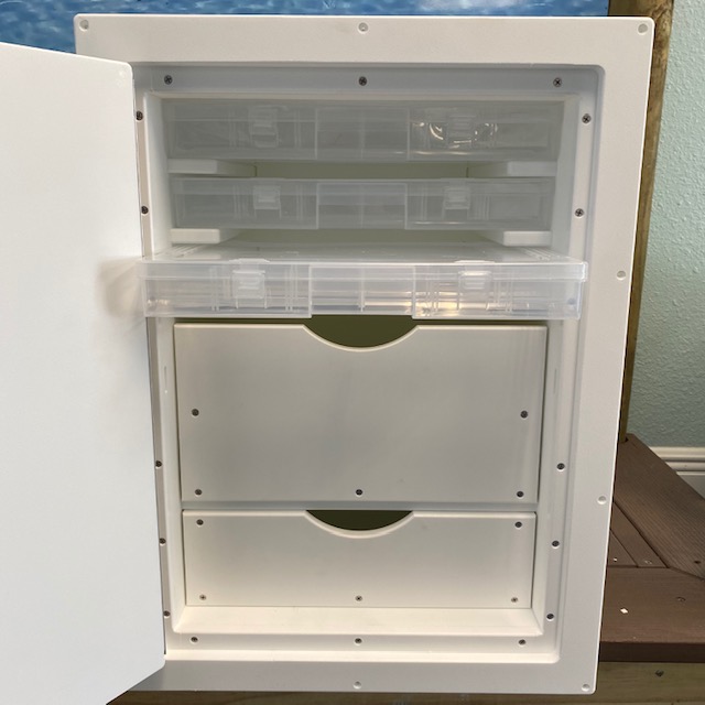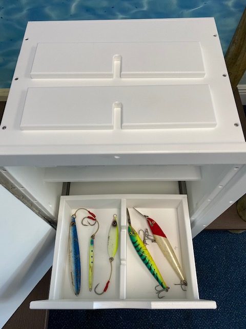 Tackle Center #TCL3T2D. Built with King Starboard and stainless hardware.  Stainless drawer slides.  Has removable/adjustable dividers for different configurations of storage.