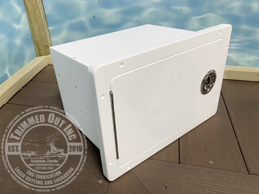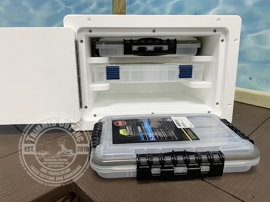 Tackle Center #TCS3SH. Three Tiered Plano Tray Organizer Tackle Station- Side Hinge.  This Three Tiered Plano Tray Organizer Tackle Station is the perfect solution for keeping your tackle accessible and organized.  This can easily be cut into your console for a quick tackle organization solution.  This is a budget friendly option to a full blown tackle center. GemLux Stainless Steel Latch.