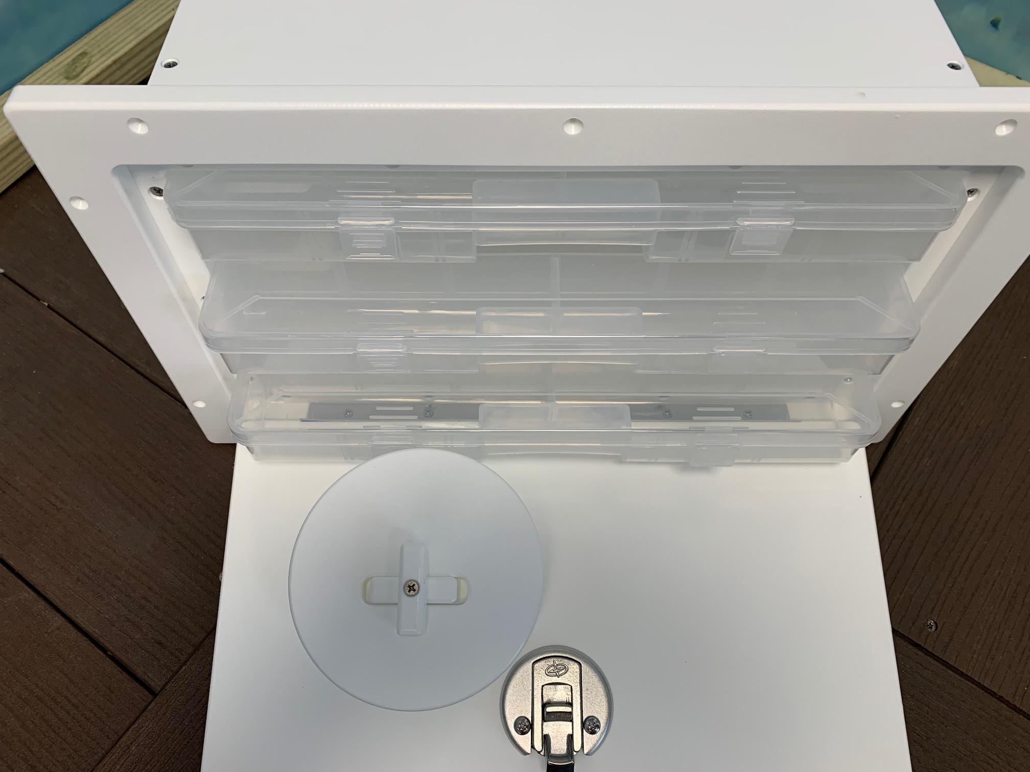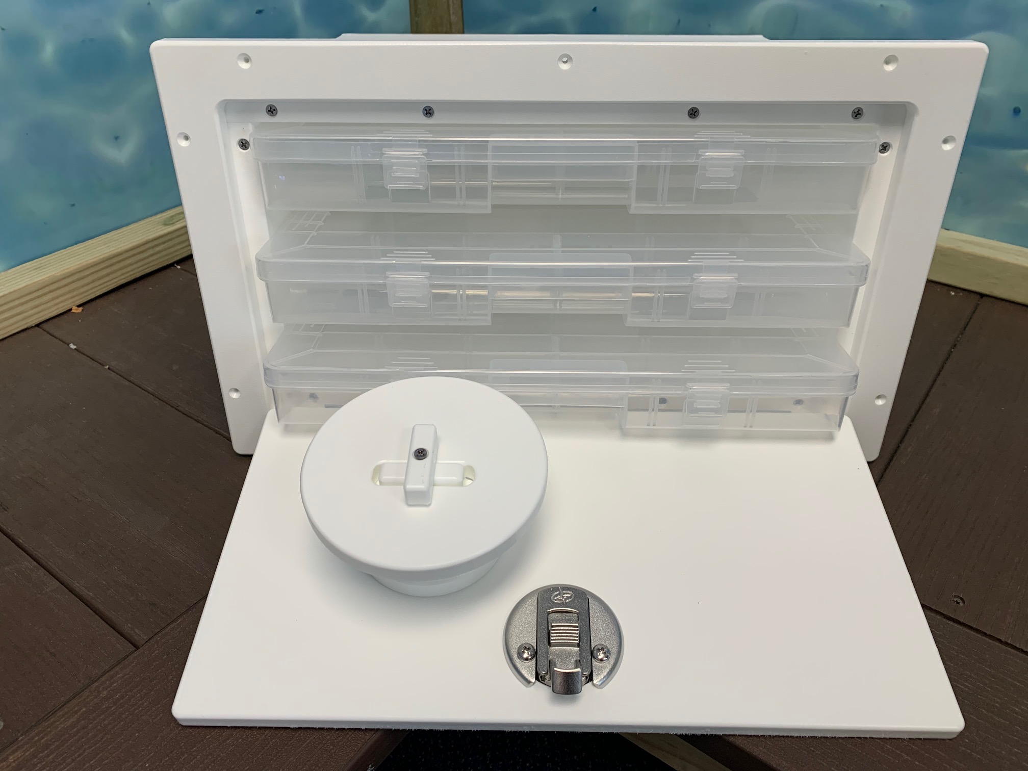 Tackle Center #TCS3TBH. Three Tiered Plano Tray Organizer Tackle Station- Bottom Hinge. This Three Tiered Plano Tray Organizer Tackle Station is the perfect solution for keeping your tackle and leader spools accessible and organized. This can easily be cut into your console for a quick tackle organization solution. This is a budget friendly option to a full blown tackle center. GemLux Stainless Steel Latch.